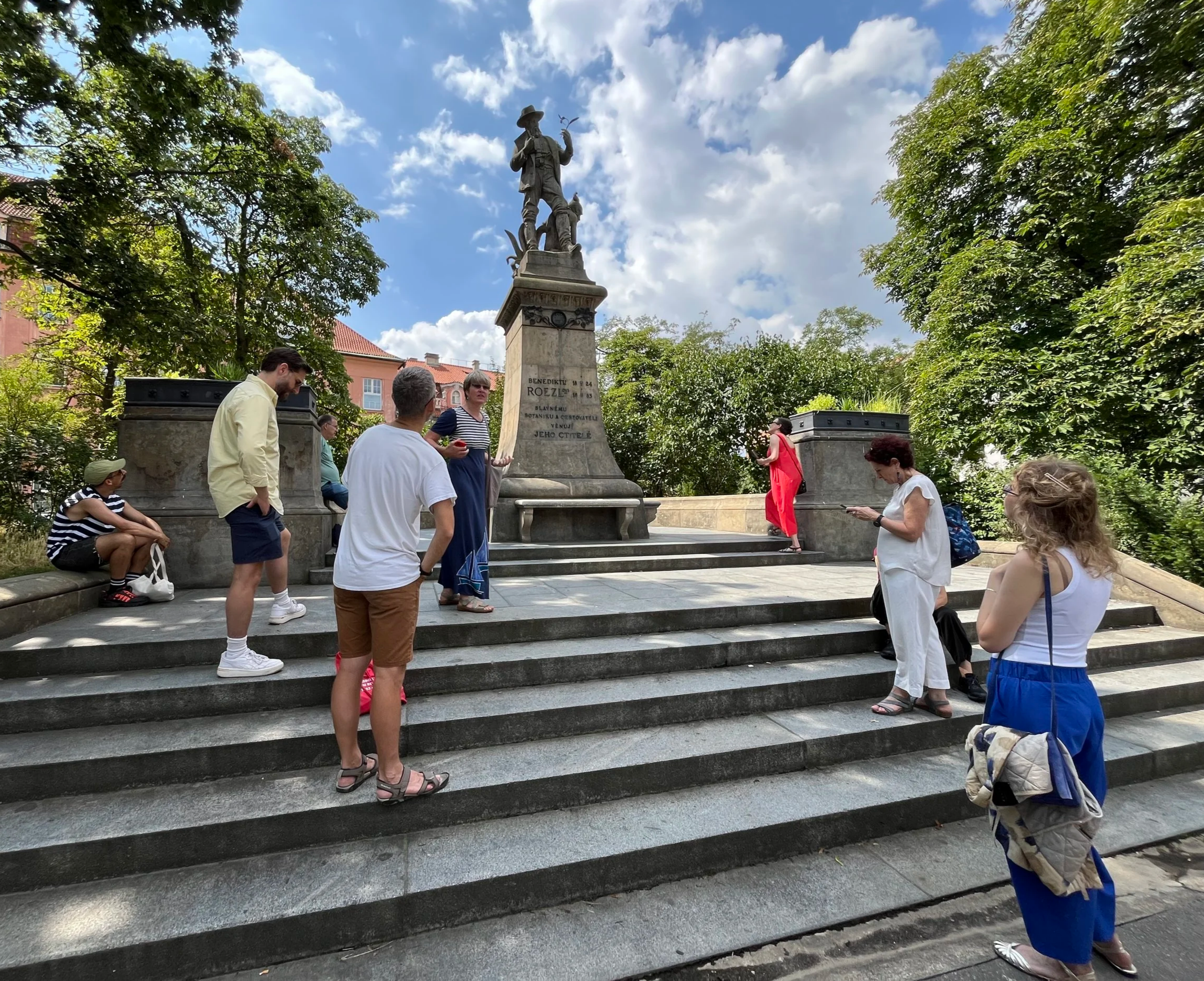 On one hot July morning, Prof. Markéta Křížová of Charles University led a group of TTTM’s National Heritage and Traumatic Memory (NHTM) research cluster members – gathered in the Czech capital to participate in the Memory Studies Association’s Annual Conference – through the streets and alleys of Prague, highlighting for us visible, if not , traces of the city’s implication in colonial histories. The walking tour formed the core of our cluster’s annual retreat, but it was also a much-needed exercise after the 5 intense days of panels, roundtables, and plenary sessions, all indoors. Strolling around back streets and bridges of Prague’s historic heart, Markéta pointed out various figures illuminated by the sun’s summer rays. Representing noblemen and Jesuit priests, some of them closely linked to Czech culture and history, with the latter particularly involved the ‘civilizational mission’ of spreading Christianity across the world – a key pillar of European colonial ideology.