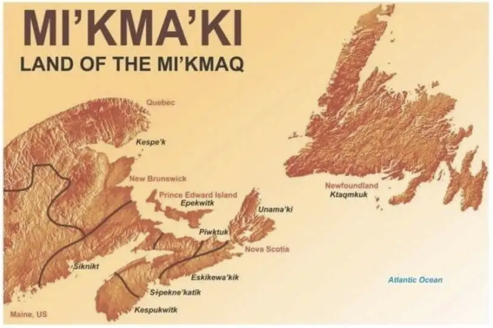 The territory of Mi’kma’ki includes modern day Nova Scotia, Newfoundland, PEI, Northern Maine, and the Gaspé Peninsula. Image from Native Land. To see what territory you live on, visit their interactive map.