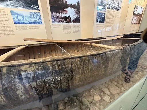 Chief Malti Pictou’s birch bark Canoe on display at the Maritime Museum of the Atlantic. Measuring 4.7mm, Chief Pictou used his canoe to hunt porpoise’s in the Bay of Fundy, 1890-1920. In 1936, Matthew Pictou used the canoe in Twilight of Micmac Porpoise Hunters [65]. The canoe was donated to the museum in 1975. Photo by Krista Collier-Jarvis (August 2023).